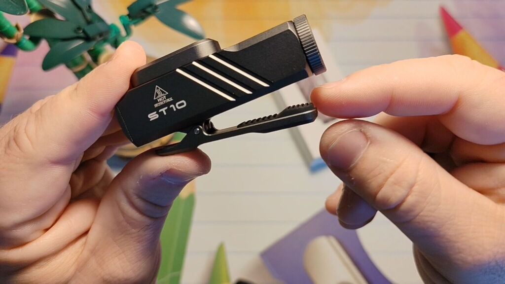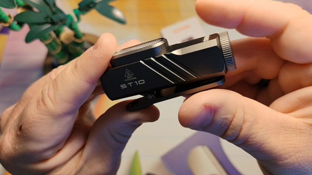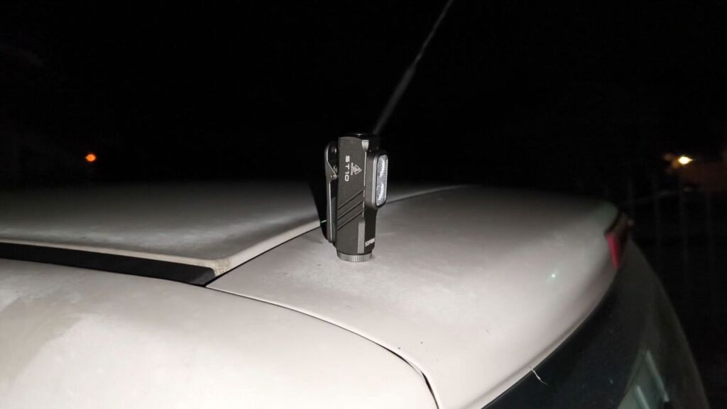 Die eienaardigheid van hierdie SOFIRN ST10 taktiese flitslig lê in twee dinge: die eerste is die magnetiese bevestiging wat in die basis geplaas is, d.w.s. die batteryklepdeksel, maar die magneet is ook in die klem teenwoordig, wat die moontlikheid bied om die flitslig aan lamppale, motorbakwerk, ens. te heg. Verder het ons 'n driedubbele lig: die boonste een met 'n direkte straal en 'n helderheid van tot 1000 lumen en dan twee sy-LED's, met diffuse lig of rooi lig vir die nag met helderheid van onderskeidelik 500 lumen en 100 lumen.